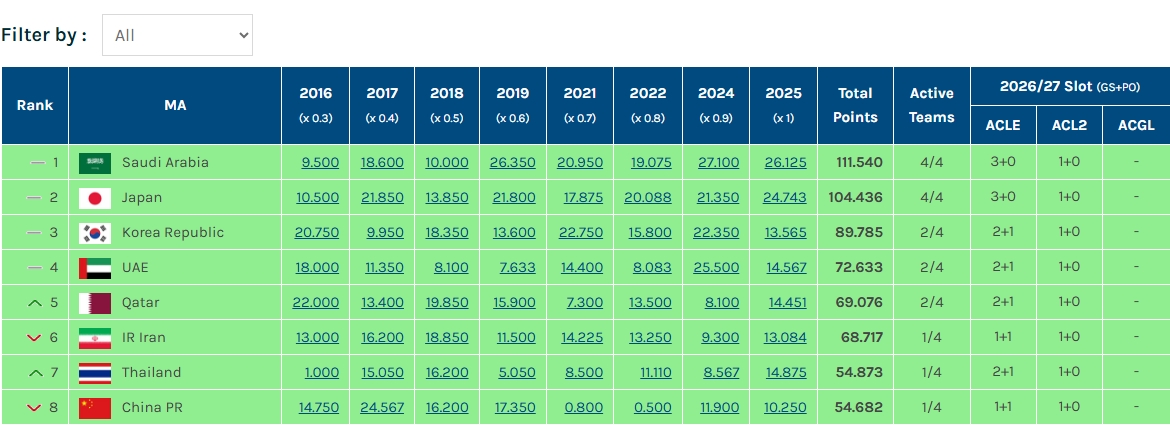 亞足聯(lián)俱樂部技術分東亞區(qū)第4,1+1個亞冠精英聯(lián)賽名額,1個亞冠2聯(lián)賽名額