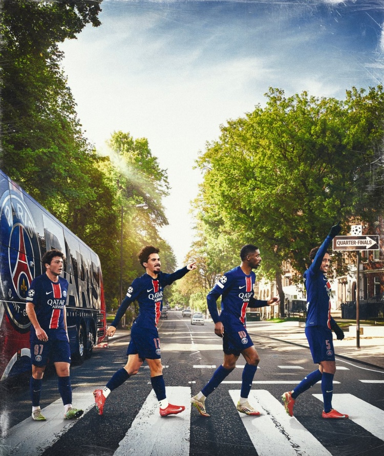 巴黎社媒賽后曬披頭士風(fēng)格海報(bào)慶祝晉級(jí),若奧-內(nèi)維斯、維蒂尼亞、登貝萊、馬爾基尼奧斯以及球隊(duì)大巴出現(xiàn)在畫(huà)面中,箭頭直指1/4決賽。