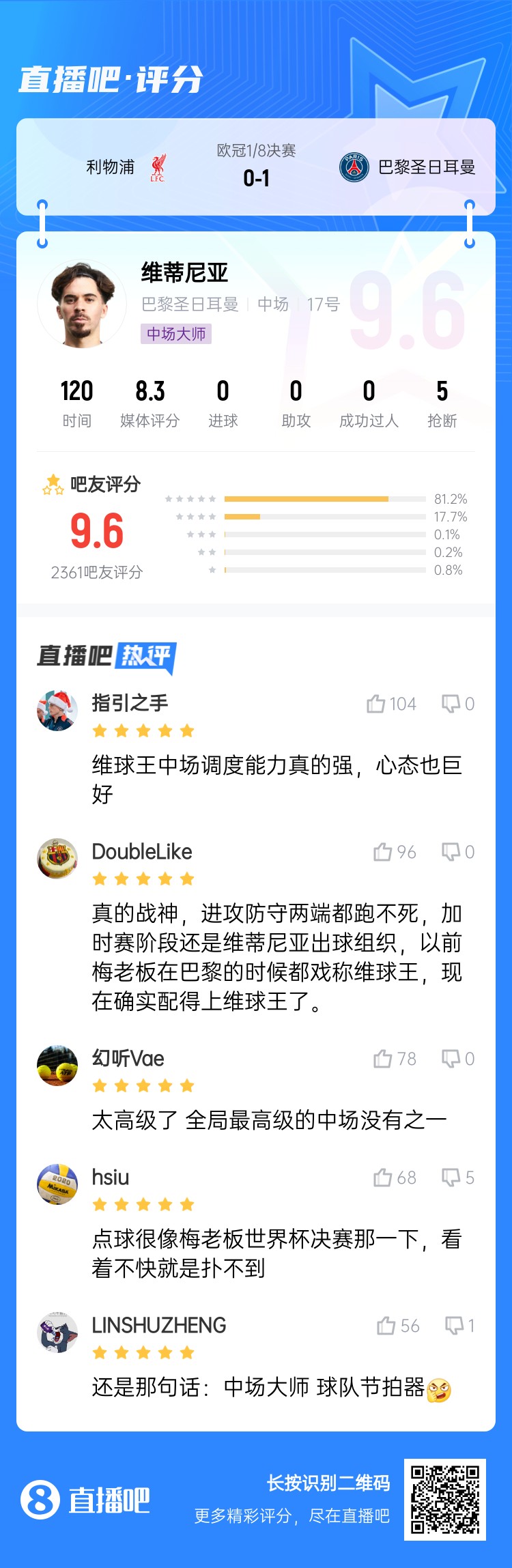 03月12日訊 歐冠1/8決賽次回合,巴黎點(diǎn)球大戰(zhàn)擊敗利物浦晉級(jí),巴黎中場維蒂尼亞本場發(fā)揮出色,表現(xiàn)壓過了利物浦的“麥8赫”(麥卡利斯特+索博斯洛伊+赫拉芬貝赫)組合,受到球迷們的一致好評(píng)。