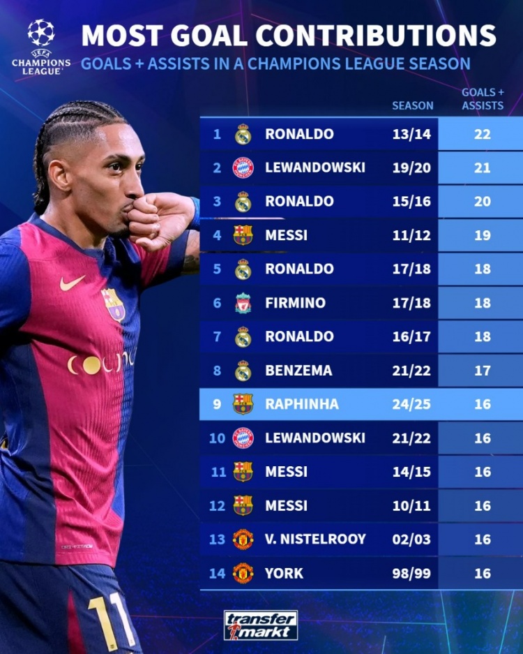 3月12日訊 本賽季拉菲尼亞在歐冠已經(jīng)有11球5助攻,直接參與16球。德轉(zhuǎn)也盤(pán)點(diǎn)了歐冠歷史單賽季參與進(jìn)球榜,其中C羅22球居首,具體如下(進(jìn)球+助攻):