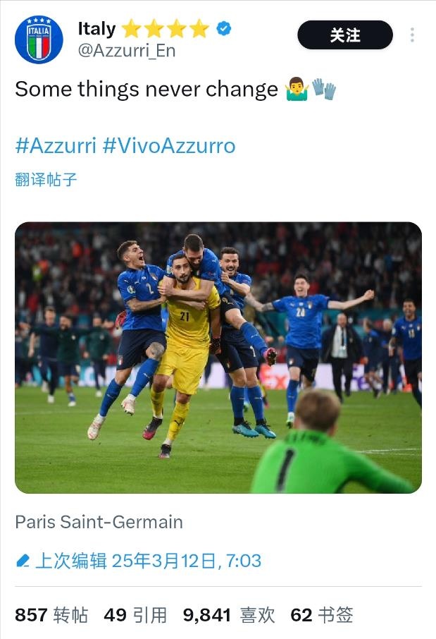賽后,意大利國(guó)家隊(duì)官推曬出了2020歐洲杯決賽多納魯馬撲出決勝點(diǎn)球的瞬間,并寫道:“有些事情永遠(yuǎn)都不會(huì)改變”。當(dāng)時(shí)意大利隊(duì)與東道主英格蘭隊(duì)在決賽戰(zhàn)至點(diǎn)球大戰(zhàn),三獅軍團(tuán)第4、5順位出場(chǎng)的桑喬和薩卡的點(diǎn)球都被多納魯馬擋出,英格蘭隊(duì)無(wú)緣隊(duì)史首座歐洲杯冠軍。繼那屆歐洲杯之后,多納魯馬再次給英格蘭足球送上一記“重?fù)簟薄?/span>