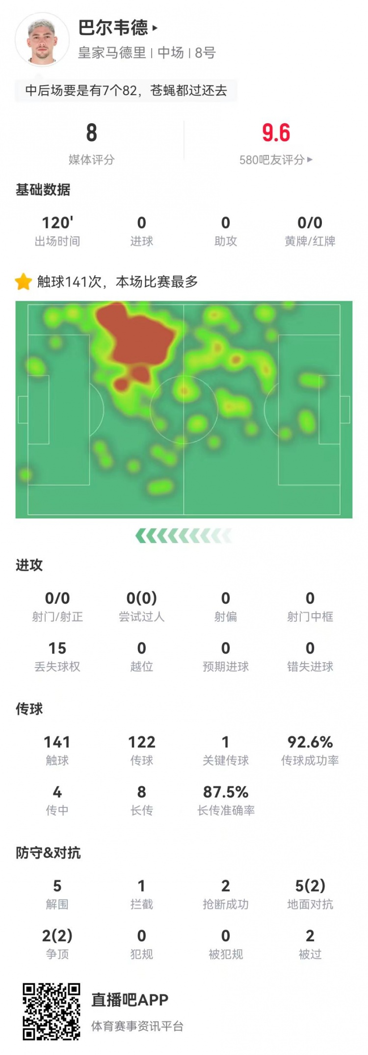 3月13日訊 皇馬在本輪歐冠點(diǎn)球淘汰馬競(jìng),巴爾韋德本場(chǎng)數(shù)據(jù)如下: