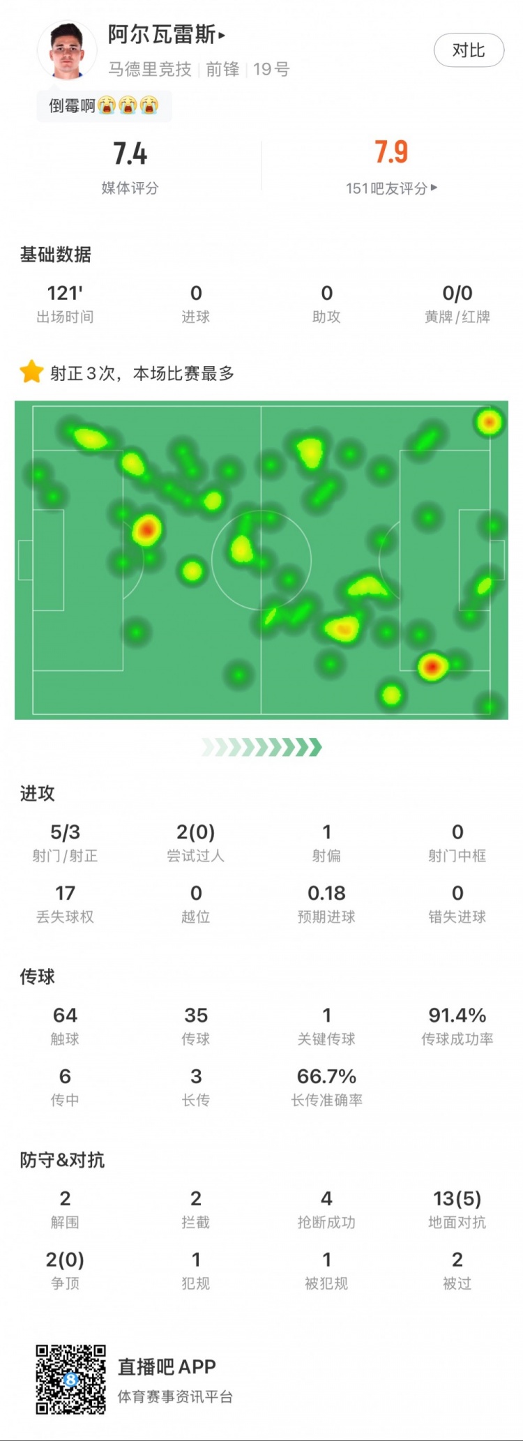 3月13日訊 歐冠1/8決賽次回合,皇馬經(jīng)過點(diǎn)球大戰(zhàn)淘汰馬競。阿爾瓦雷斯本場數(shù)據(jù):