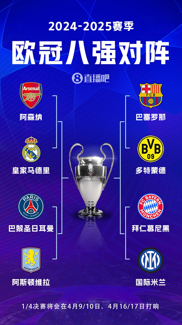 發(fā)布時間:2025年03月13日 07:50點擊:欄目:足球新聞 【歐冠八強對陣】??歐冠8強對陣:槍手vs皇馬|拜仁vs國米|巴薩vs多特|巴黎vs維拉歐冠16強對陣結束,8強完整對陣出爐!歐冠8強聯(lián)賽分布:英超西甲德甲各2隊,意甲、法甲均1隊歐冠8強正式出爐 除特別注明外,本站所有內(nèi)容均為九球直播整理排版,轉載請注明出處:早報:八強出爐,歐冠論劍! 本文標簽: 英超 曼聯(lián) 切爾西 阿森納 曼城 利物浦 熱刺 西甲 皇家馬德里 巴塞羅那 馬德里競技 意甲 AC米蘭 國際米蘭 尤文圖斯 羅馬 那不勒斯 德甲 拜仁慕尼黑 多特蒙德 RB萊比錫 勒沃庫森 法甲 巴黎圣日耳曼 中超 足球 中國足球