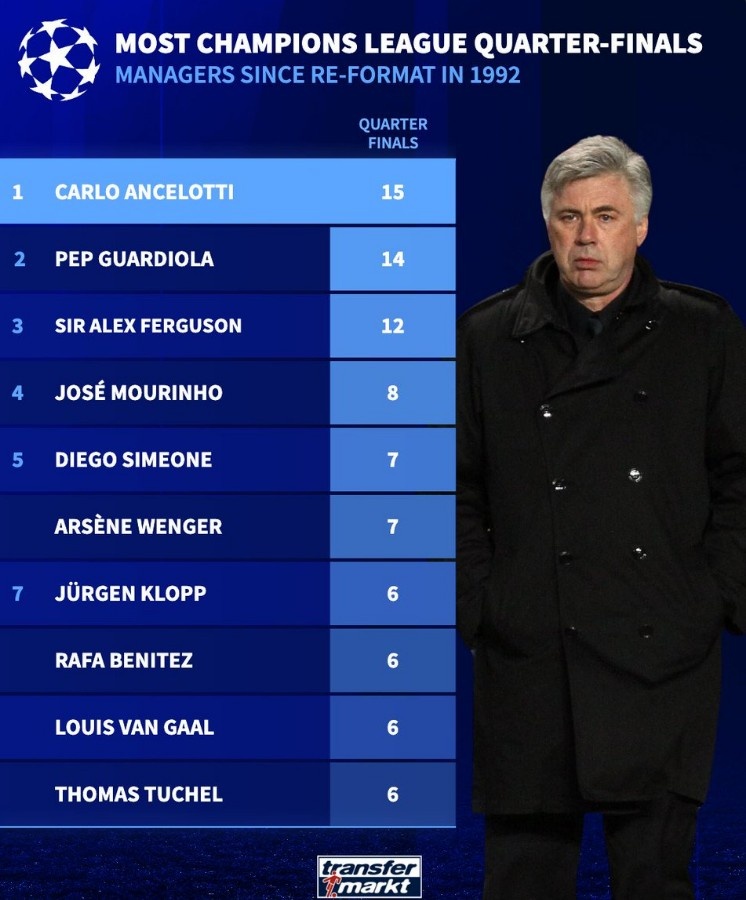 發(fā)布時間:2025年03月13日 08:50點(diǎn)擊:欄目:足球新聞 3月13日訊 在本輪歐冠,皇馬點(diǎn)球大戰(zhàn)擊敗馬競晉級。德轉(zhuǎn)也盤點(diǎn)了歐冠改制后主帥率領(lǐng)球隊晉級8強(qiáng)的次數(shù)榜,其中安切洛蒂居首。具體如下:1、安切洛蒂 15次2、瓜迪奧拉 14次3、弗格森 12次4、穆里尼奧 8次5、西蒙尼、溫格 7次7、克洛普、貝尼特斯、范加爾、圖赫爾 6次 除特別注明外,本站所有內(nèi)容均為九球直播整理排版,轉(zhuǎn)載請注明出處:歐冠改制后主帥晉級8強(qiáng)次數(shù)榜:安切洛蒂15次居首,瓜帥次席 本文標(biāo)簽: 足球 英超 皇家馬德里 西甲 曼城