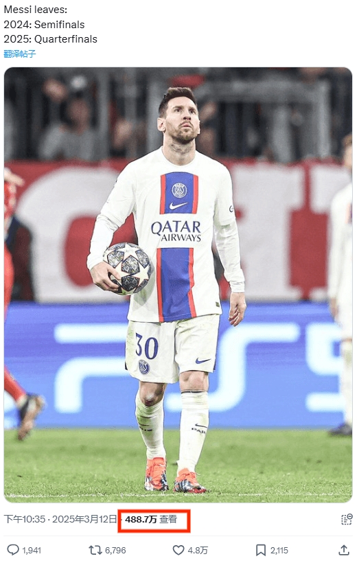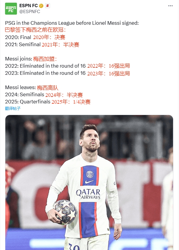 發(fā)布時(shí)間:2025年03月13日 10:50點(diǎn)擊:欄目:足球新聞 歐冠1/8決賽,巴黎圣日耳曼淘汰利物浦,晉級(jí)8強(qiáng),將在1/4決賽對(duì)陣維拉。ESPN在賽后發(fā)文對(duì)比巴黎有無(wú)梅西時(shí)的歐冠成績(jī),在社媒上成為大熱帖,目前瀏覽量已超過(guò)488萬(wàn)。 除特別注明外,本站所有內(nèi)容均為九球直播整理排版,轉(zhuǎn)載請(qǐng)注明出處:ESPN:巴黎有梅西2年止步16強(qiáng),無(wú)梅西進(jìn)1/4決賽 半決賽 決賽 本文標(biāo)簽: 足球 梅西 法甲 巴黎圣日耳曼