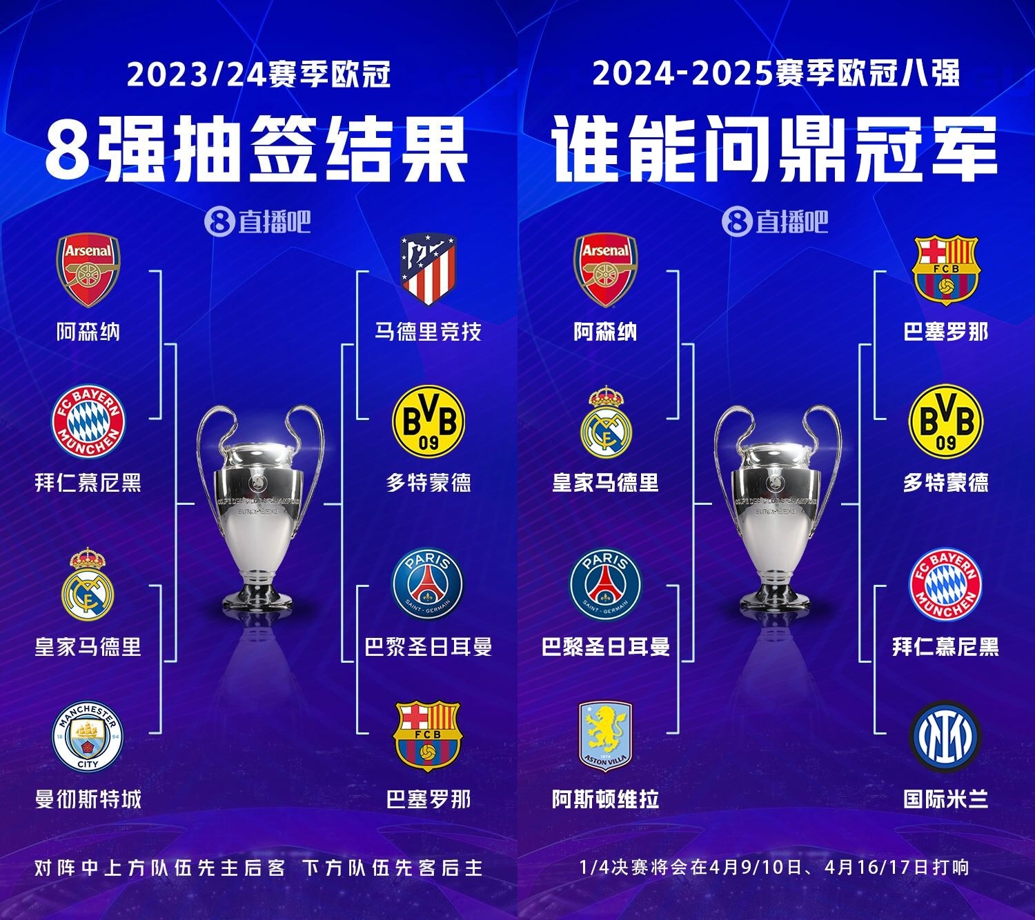 發(fā)布時間:2025年03月13日 13:50點擊:欄目:足球新聞 23/24賽季歐冠8強:阿森納vs拜仁,皇馬vs曼城,馬競vs多特,巴黎vs巴薩24/25賽季歐冠8強:阿森納vs皇馬,巴黎vs維拉,巴薩vs多特,拜仁vs國米 除特別注明外,本站所有內(nèi)容均為九球直播整理排版,轉(zhuǎn)載請注明出處:僅換2席!上賽季8強PK本賽季:6隊一樣,僅國米維拉換掉曼城馬競 本文標(biāo)簽: 足球 英超 西甲 意甲 德甲 法甲 巴黎圣日耳曼 拜仁慕尼黑 多特蒙德 國際米蘭 皇家馬德里 巴塞羅那 馬德里競技 阿森納 曼城 阿斯頓維拉 歐冠