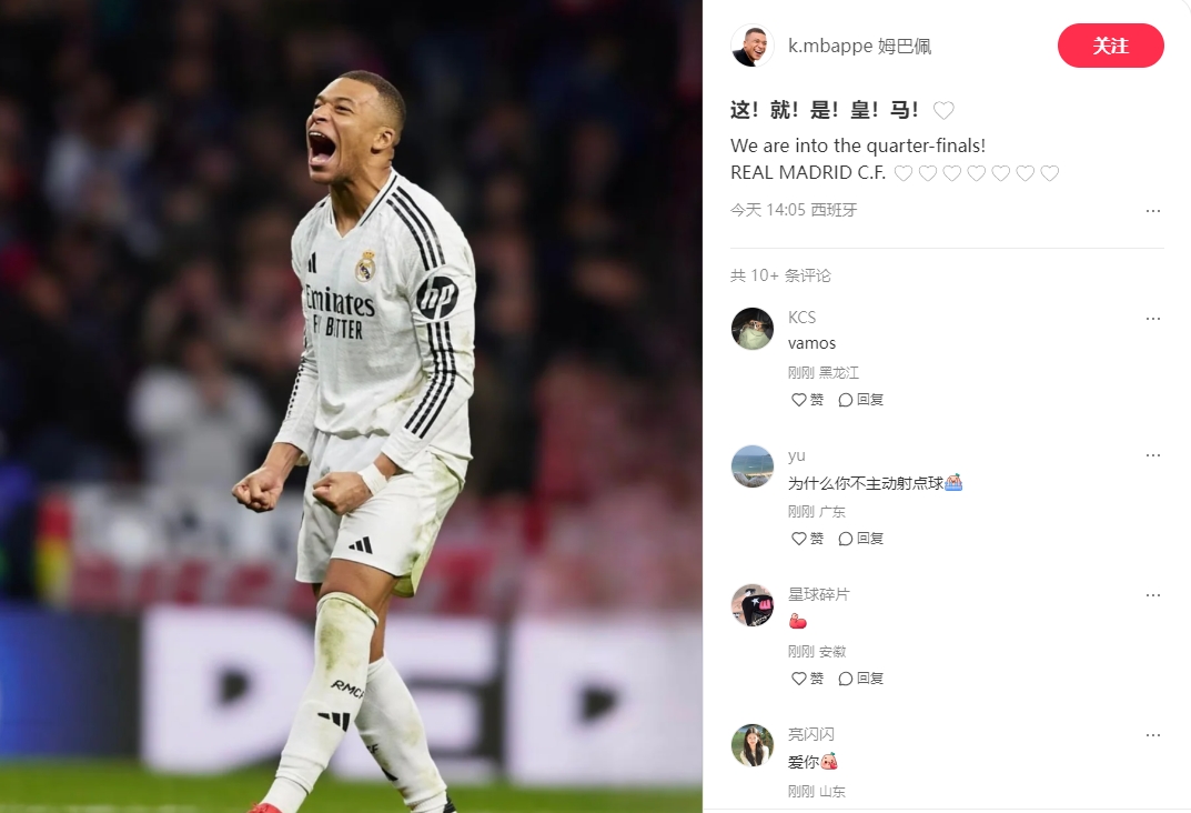 發(fā)布時(shí)間:2025年03月13日 14:50點(diǎn)擊:欄目:足球新聞 03月13日訊 皇馬兩回合2-2,點(diǎn)球大戰(zhàn)4-2擊敗馬競晉級(jí)歐冠8強(qiáng)。姆巴佩更新小紅書寫道:這!就!是!皇!馬!We are into the quarter-finals!REAL MADRID C.F.(我們進(jìn)入了1/4決賽!皇家馬德里俱樂部) 除特別注明外,本站所有內(nèi)容均為九球直播整理排版,轉(zhuǎn)載請注明出處:很興奮!姆巴佩更新個(gè)人中文社媒:這!就!是!皇!馬! 本文標(biāo)簽: 足球 西甲 皇家馬德里 姆巴佩