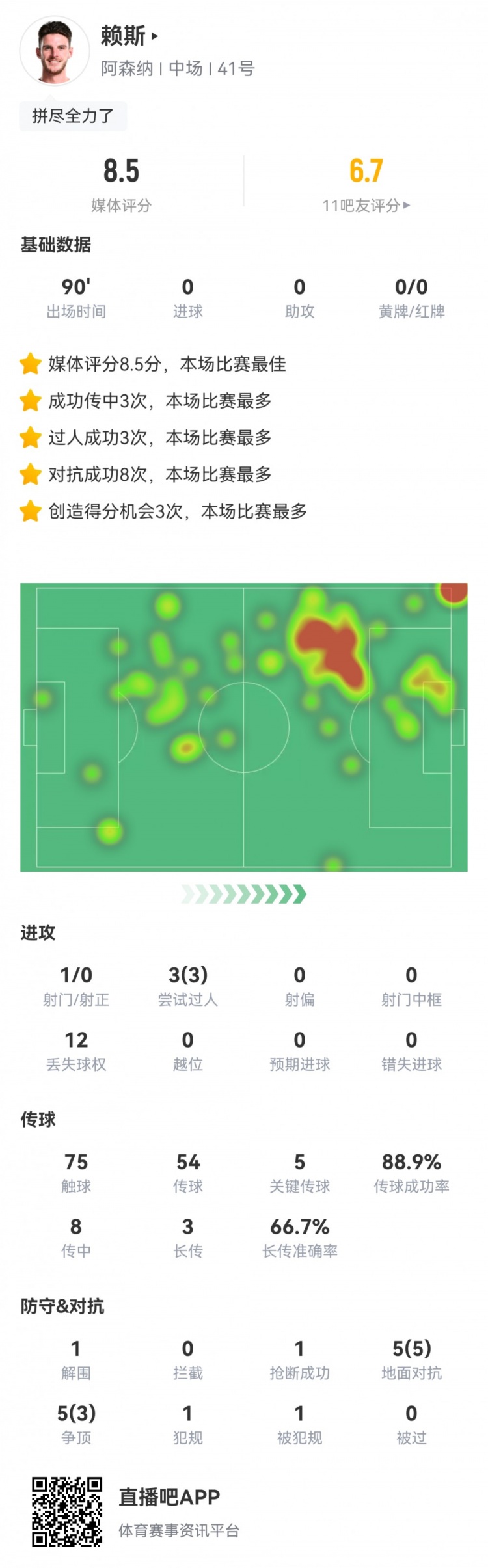 除特別注明外,本站所有內(nèi)容均為九球直播整理排版,轉(zhuǎn)載請注明出處:盡力局!賴斯數(shù)據(jù):5次關鍵傳球,8次成功對抗,獲全場最高8.5分