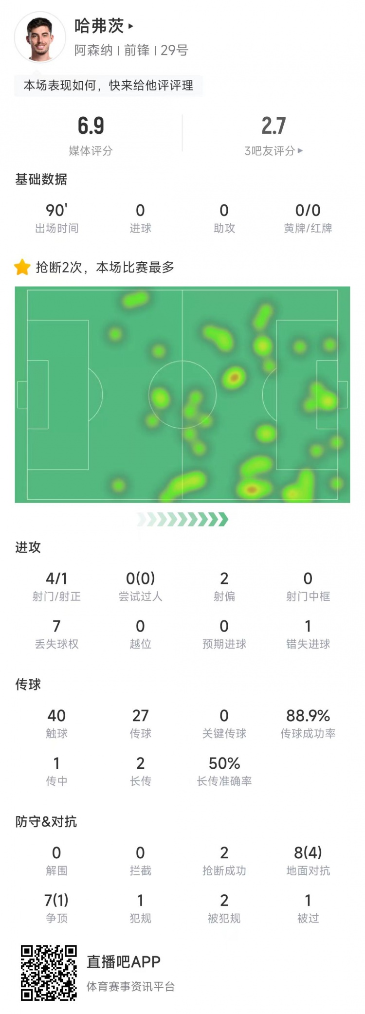 除特別注明外,本站所有內(nèi)容均為九球直播整理排版,轉(zhuǎn)載請注明出處:哈弗茨本場數(shù)據(jù):4次射門1次射正,15次對抗5次成功&獲評6.9分