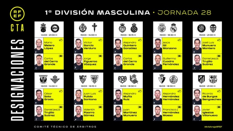 3月13日訊 西甲第28輪聯(lián)賽各場(chǎng)執(zhí)法裁判公布,曼薩諾執(zhí)法比利亞雷亞爾vs皇馬,本戈切亞執(zhí)法馬競(jìng)vs巴薩。