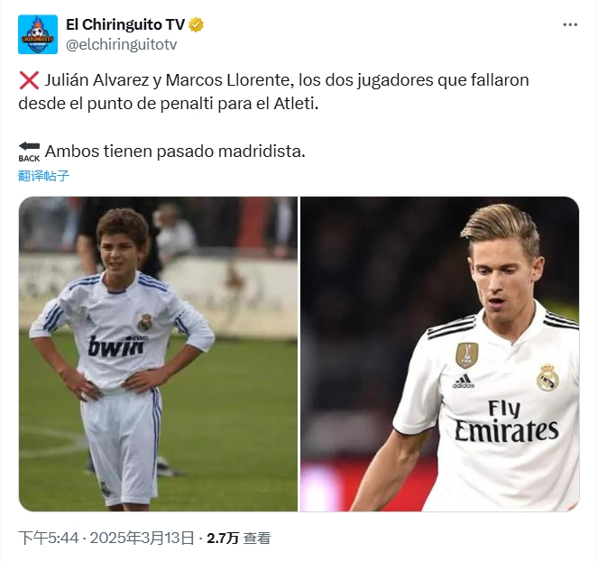 西班牙六臺曬出兩人舊照,表示這兩名球員都曾身穿皇馬球衣,阿爾瓦雷斯11歲時曾參加皇馬的試訓(xùn),但并未加盟。略倫特則是出自皇馬青訓(xùn),在2019年以3000萬轉(zhuǎn)會費加盟馬競。