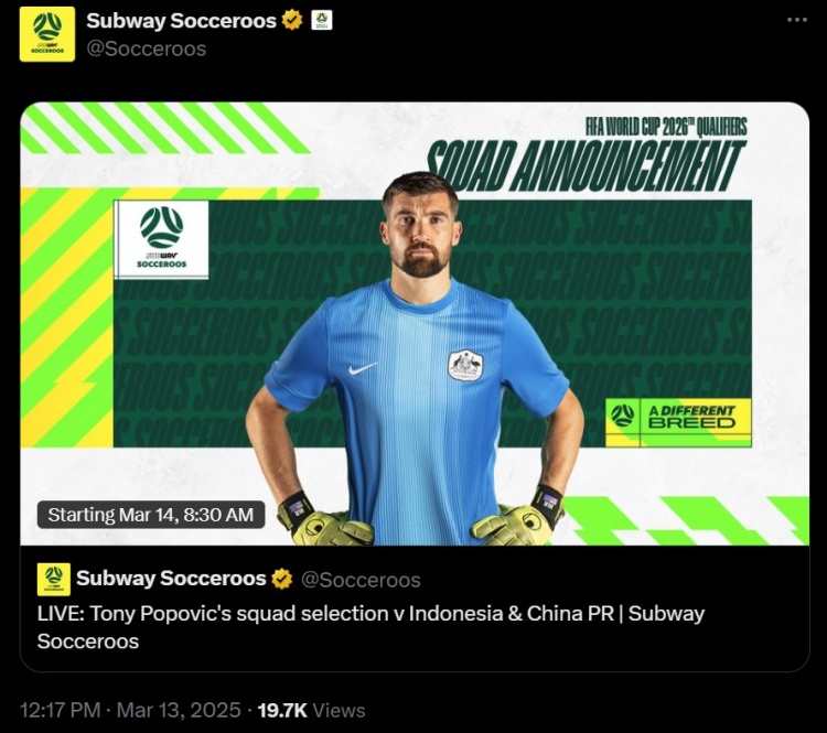 發(fā)布時(shí)間:2025年03月13日 19:50點(diǎn)擊:欄目:足球新聞 3月13日訊 官方消息,澳大利亞主帥波波維奇將在明日上午八點(diǎn)半公布最新一期國家隊(duì)名單。本月世預(yù)賽,澳大利亞將主場戰(zhàn)印尼,客場對陣中國隊(duì)。 除特別注明外,本站所有內(nèi)容均為九球直播整理排版,轉(zhuǎn)載請注明出處:將戰(zhàn)國足!官方:澳大利亞新一期名單明日上午8:30公布 本文標(biāo)簽: 足球 中國足球 澳大利亞 五洲