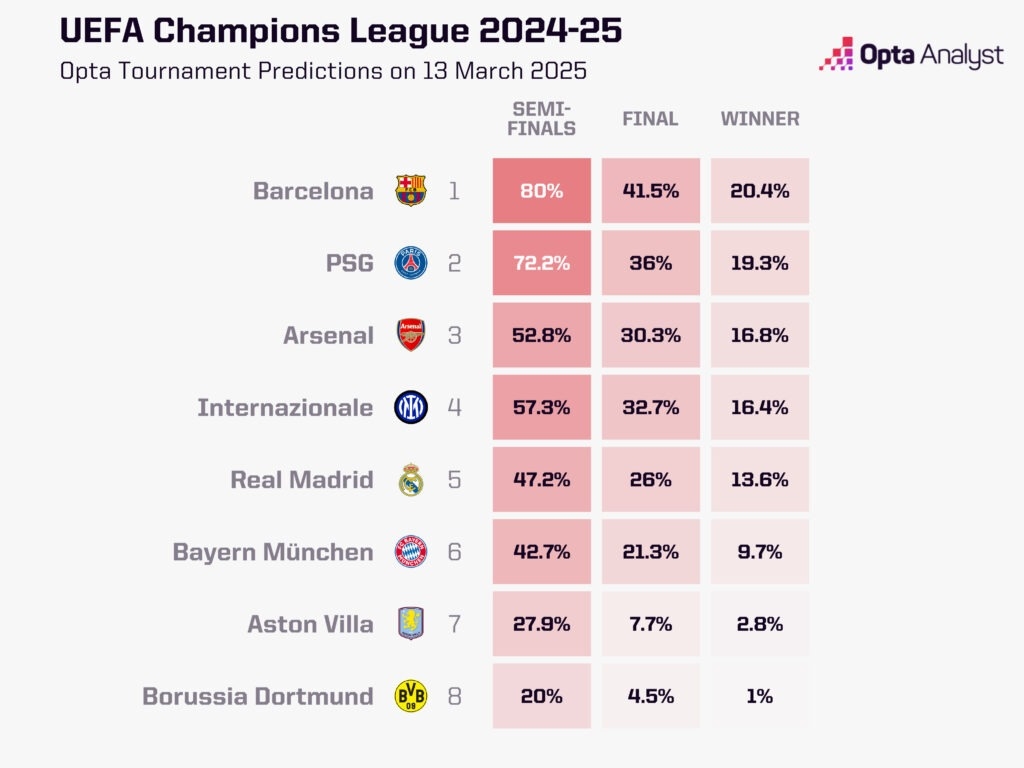 03月13日訊 歐冠1/8決賽全部結(jié)束,opta也更新了最新的歐冠奪冠概率,其中巴薩以20.4%領(lǐng)跑,巴黎、阿森納分列二三,國(guó)米、皇馬和拜仁位列第4、第5和第6。