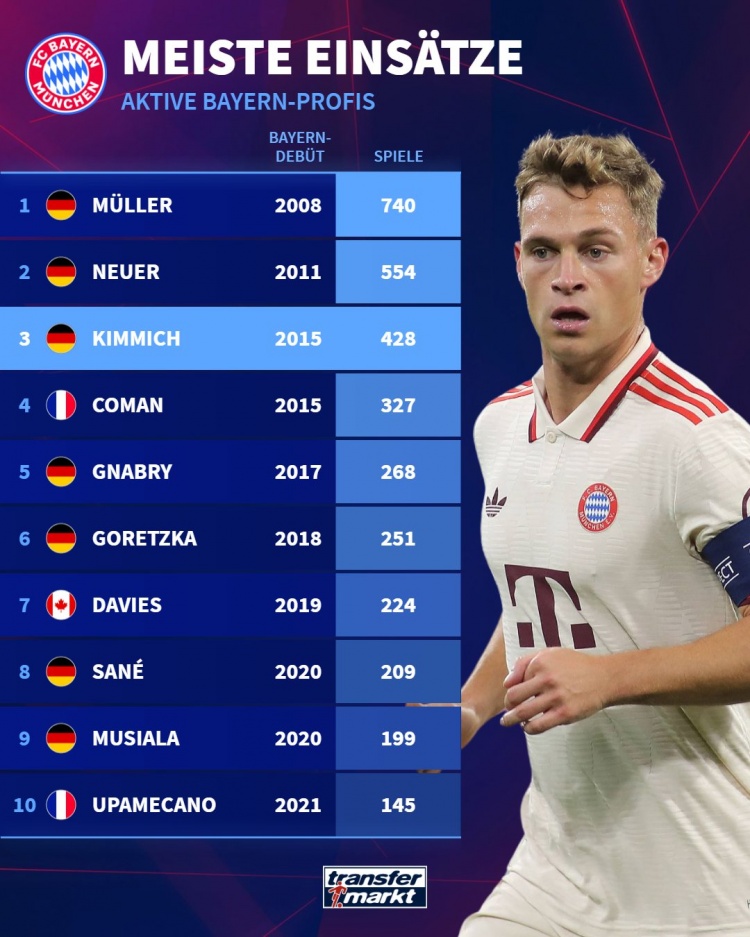 3月13日訊 拜仁今日官宣與基米希續(xù)約至2029年,據(jù)德轉(zhuǎn)數(shù)據(jù)統(tǒng)計,基米希截至目前代表拜仁在各項賽事出戰(zhàn)428場比賽,在拜仁現(xiàn)役球員中排名第三,穆勒、諾伊爾排在前二。