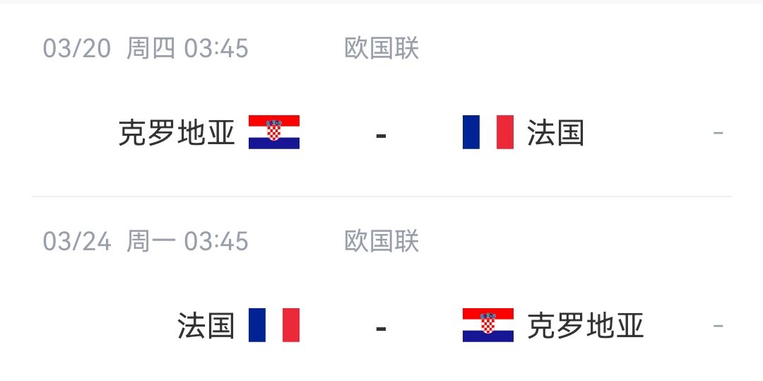 此前的歐國聯(lián)小組,法國隊(duì)力壓意大利、比利時(shí)和以色列以小組第一晉級(jí)淘汰賽,在1/4決賽中,他們要面對(duì)的是克羅地亞隊(duì)。法國與克羅地亞將在北京時(shí)間3月20日和3月24日凌晨進(jìn)行兩回合主客場的交鋒。