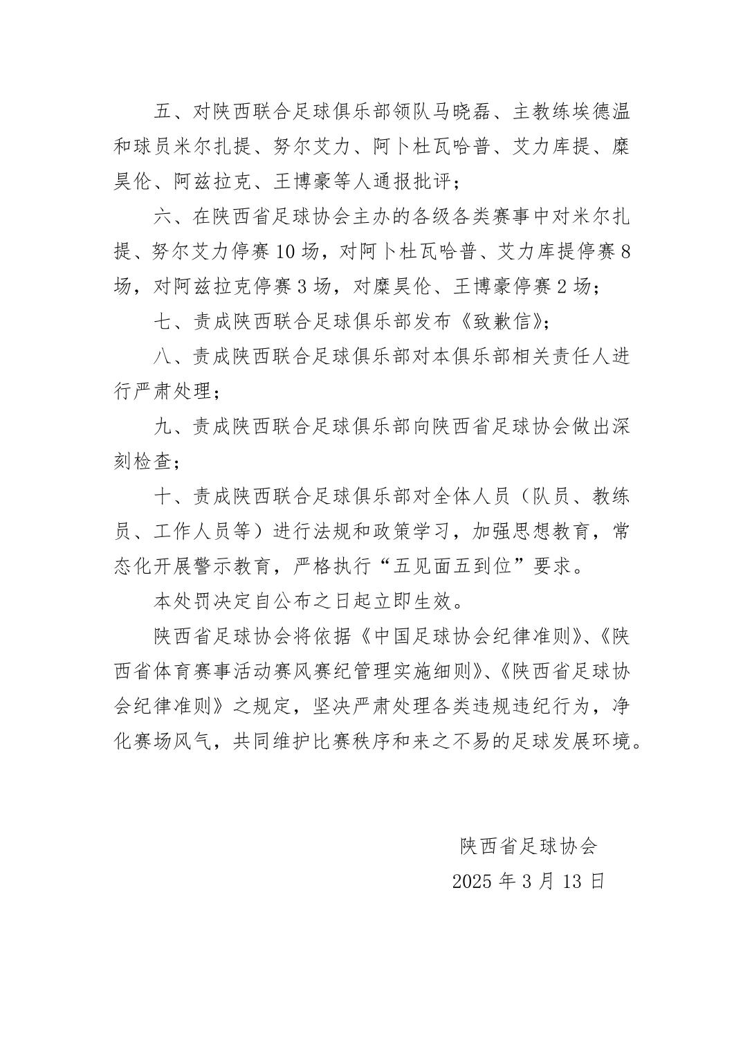 8、責成陜西聯(lián)合足球俱樂部對本俱樂部相關責任人進行嚴肅處理。