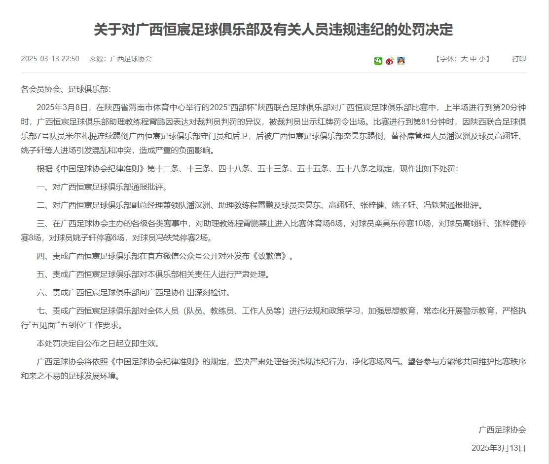 - 13人合計禁賽83場!官方:陜西&廣西兩隊處罰執(zhí)行范圍擴大至全國