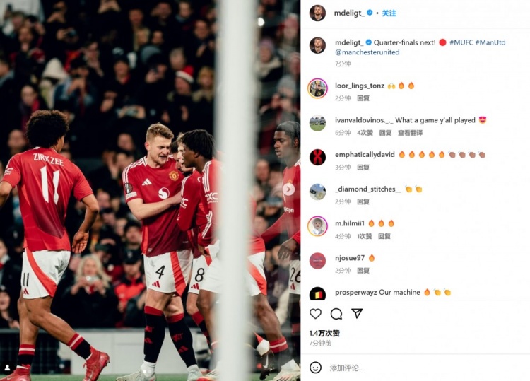 發(fā)布時間:2025年03月14日 06:50點擊:欄目:足球新聞 3月14日訊 曼聯(lián)在本輪歐聯(lián)杯4-1擊敗皇家社會,德里赫特開場送點。第7分鐘,德里赫特禁區(qū)內(nèi)鏟倒奧亞薩瓦爾,通過VAR,裁判判罰點球并對德里赫特出示黃牌,奧亞薩瓦爾破門。德里赫特也在賽后曬出和隊友的慶祝照,并配文:“下一站八強!@曼聯(lián)俱樂部?!?/p> 除特別注明外,本站所有內(nèi)容均為九球直播整理排版,轉(zhuǎn)載請注明出處:開場送點!德里赫特社媒和隊友相擁慶祝照:晉級八強戰(zhàn)! 本文標(biāo)簽: 足球 英超 曼聯(lián) 西甲 皇家社會 歐聯(lián)杯