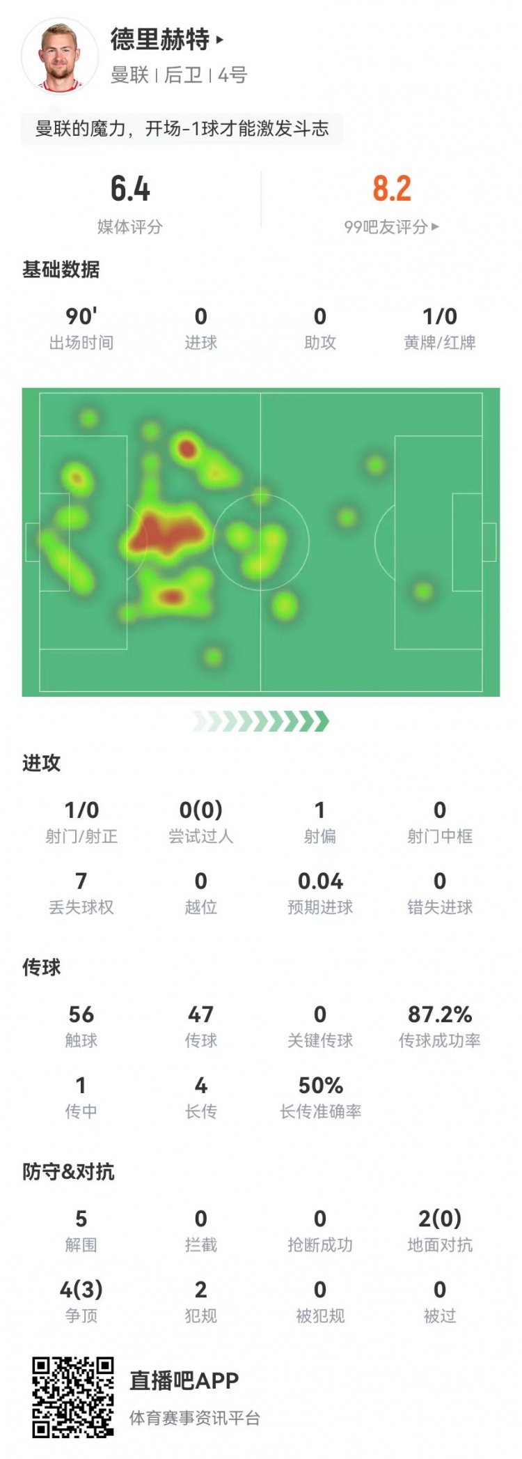 3月14日訊 曼聯(lián)在本輪歐聯(lián)杯4-1大勝皇家社會(huì),德里赫特本場數(shù)據(jù)如下: