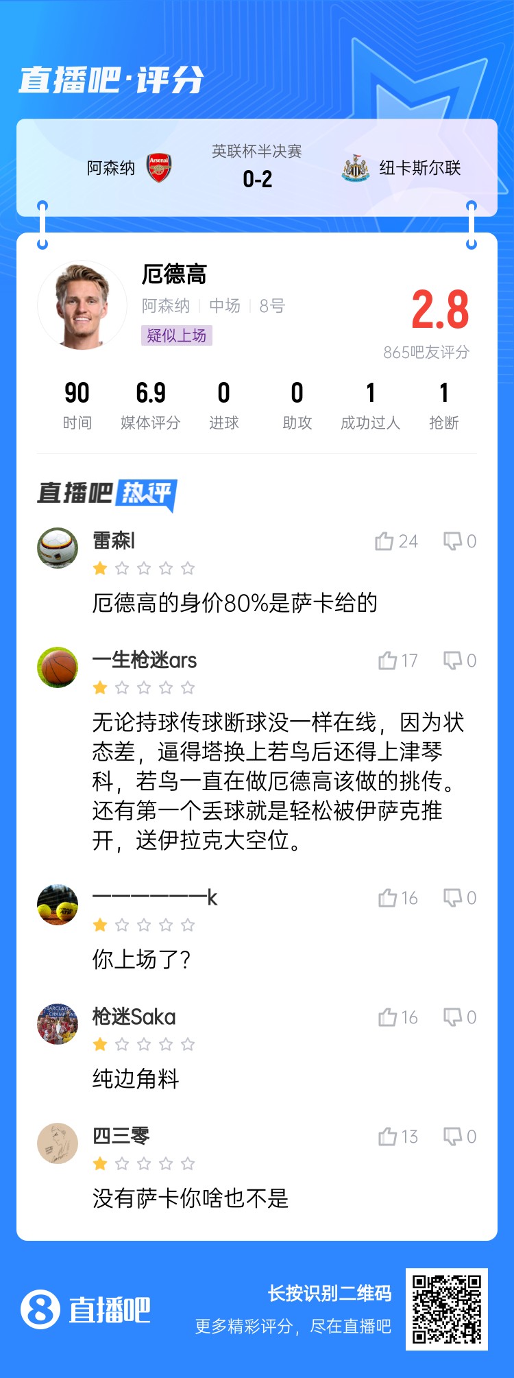 厄德高本場比賽首發(fā)踢滿全場,表現(xiàn)糟糕,被吧友打出2.8分的全隊最低分!