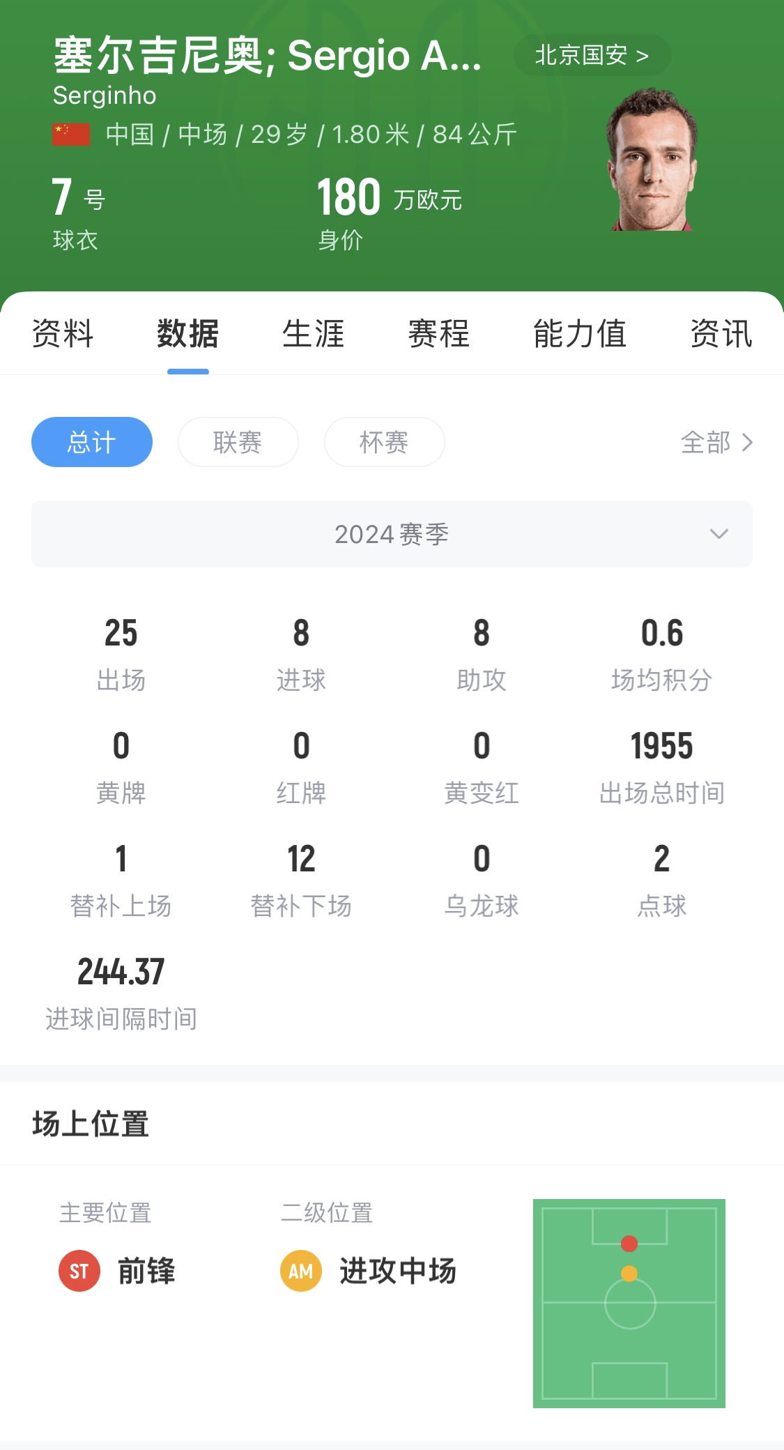 1995年3月15日出生的塞爾吉尼奧原來擁有巴西和意大利雙重國籍,2020年1月加盟長春亞泰,代表球隊出戰(zhàn)100場打進(jìn)30個進(jìn)球,完成23次助攻。2025賽季以40萬歐元的身價轉(zhuǎn)會至北京國安。轉(zhuǎn)換會籍成功的第二天,塞爾吉尼奧也將迎來自己的30歲生日。