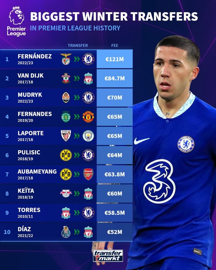 1月8日訊 德國轉(zhuǎn)會市場統(tǒng)計(jì)了五大聯(lián)賽冬窗最貴引援,并列出榜單,恩佐-費(fèi)爾南德斯1.21億歐英超標(biāo)王,庫蒂尼奧1.35億歐西甲標(biāo)王。