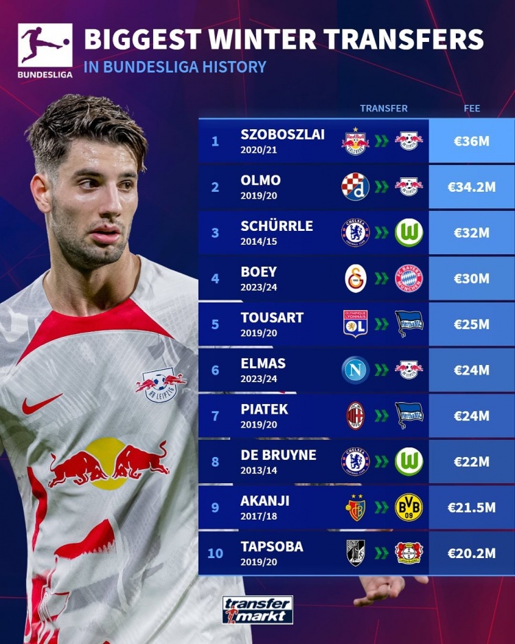 德甲冬窗最貴引援榜: