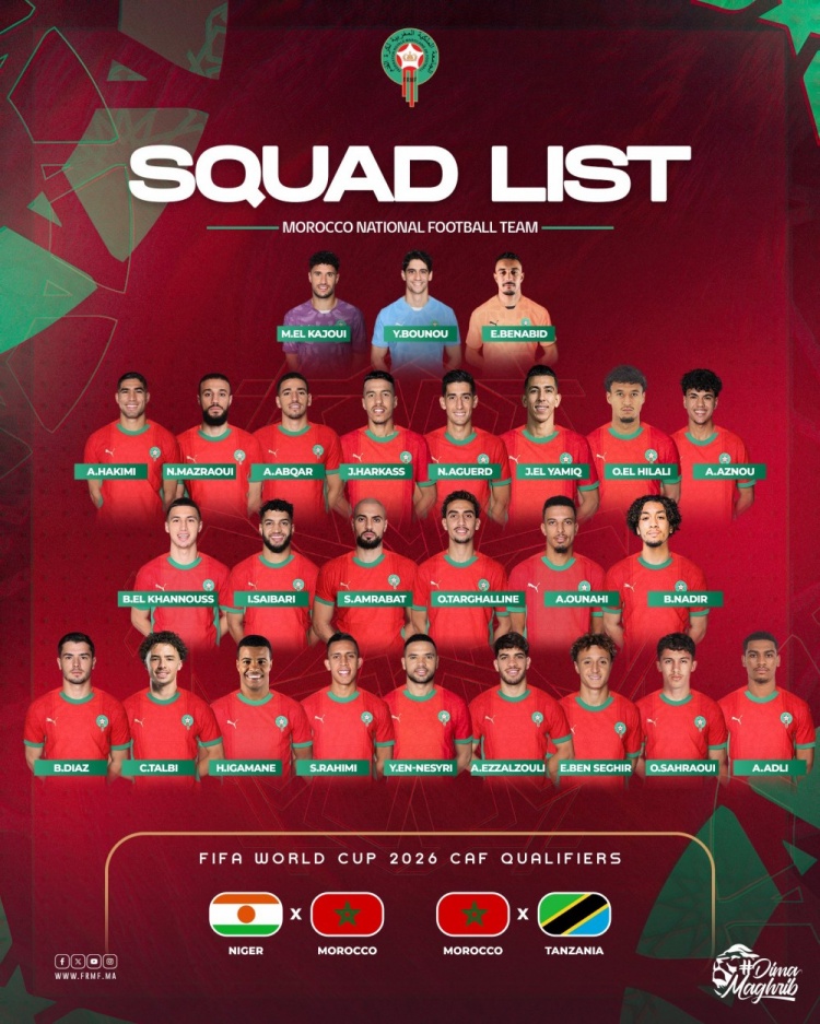 3月14日訊 摩洛哥公布最新一期國家隊(duì)名單,阿什拉夫、馬茲拉維、布拉欣-迪亞斯、恩-內(nèi)斯里、阿姆拉巴特等球員入選。