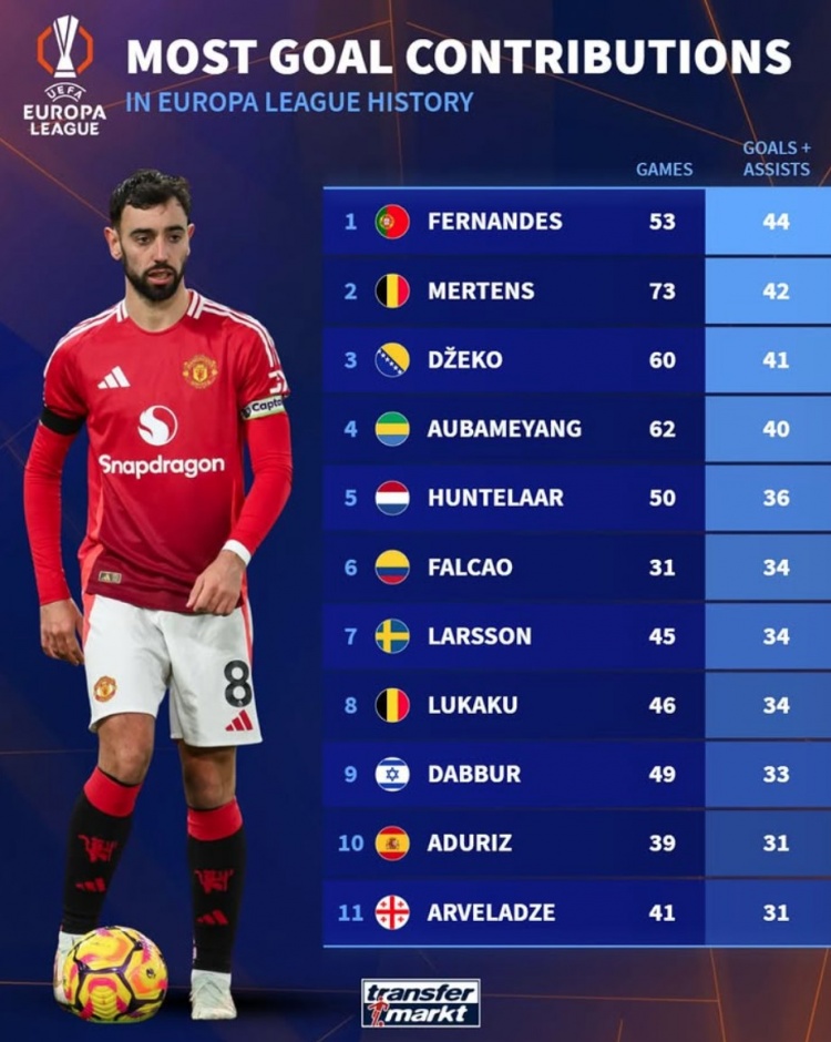 3月14日訊 曼聯(lián)在歐聯(lián)杯16強(qiáng)戰(zhàn)次回合4-1擊敗皇家社會(huì),B費(fèi)上演帽子戲法,數(shù)據(jù)統(tǒng)計(jì)顯示他已是歐聯(lián)歷史參與進(jìn)球最多的球員。