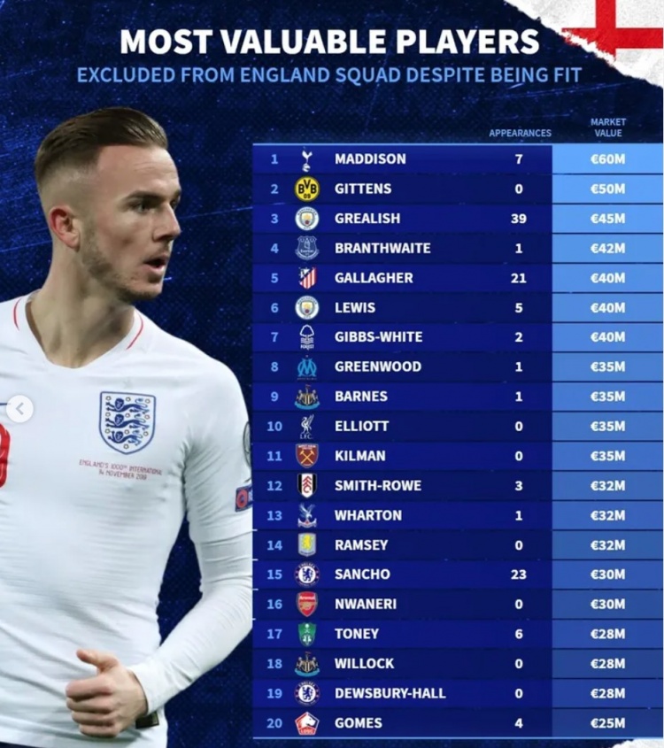 德轉(zhuǎn)列落選英格蘭隊(duì)的健康球員身價(jià)榜:歐元(及生涯國(guó)家隊(duì)出場(chǎng)數(shù))