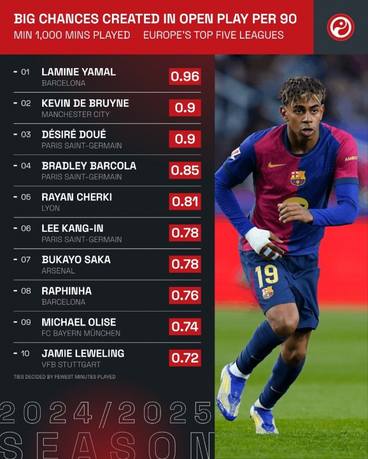 除特別注明外,本站所有內(nèi)容均為九球直播整理排版,轉(zhuǎn)載請(qǐng)注明出處:五大聯(lián)賽運(yùn)動(dòng)戰(zhàn)場(chǎng)均創(chuàng)造重大機(jī)會(huì)榜:亞馬爾居首,前6巴黎占3席