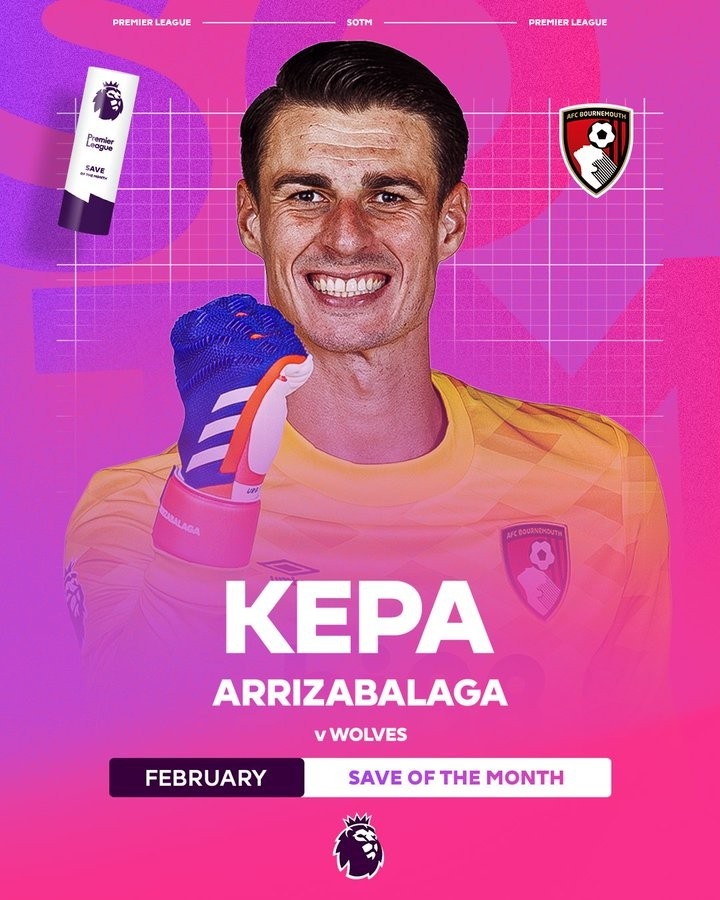 3月14日訊 英超官方宣布,切爾西外租到伯恩茅斯的門將凱帕,在對(duì)陣?yán)顷?duì)時(shí)的兩連撲當(dāng)選為英超2月最佳撲救。