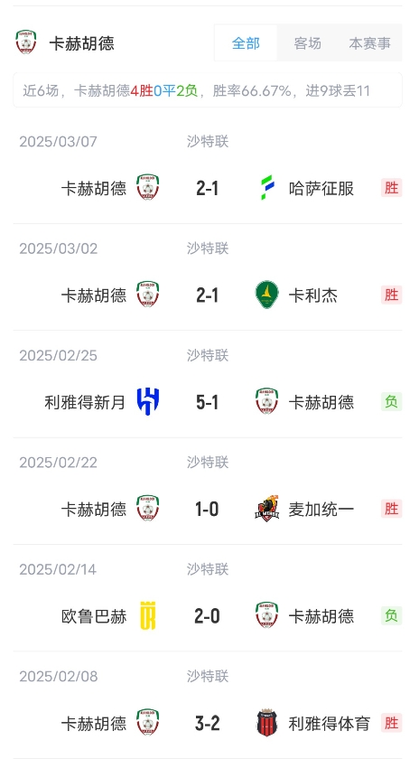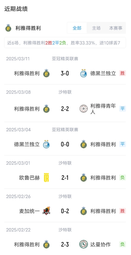 目前利雅得勝利取得了14勝6平4負的成績,積48分,暫居聯(lián)賽第4??ê蘸氯〉昧?勝4平11負成績,積31分,暫居聯(lián)賽第10。