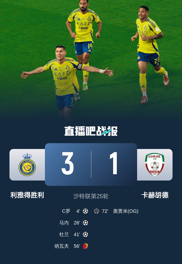 C羅破門+直塞策動,馬內(nèi)和杜蘭建功,十人利雅得勝利主場3-1戰(zhàn)勝卡赫胡德。