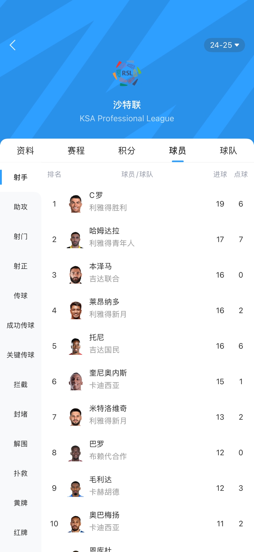 發(fā)布時間:2025年03月15日 10:50點擊:欄目:足球新聞 03月15日訊 沙特聯(lián)第25輪,利雅得勝利3-1擊敗卡赫胡德,C羅連場破門。沙特聯(lián)射手榜,40歲C羅19球領跑,37歲本澤馬遭遇4輪球荒,16球排第三,托尼16球、米特洛維奇13球、奧巴梅揚11球。 除特別注明外,本站所有內(nèi)容均為九球直播整理排版,轉(zhuǎn)載請注明出處:沙特聯(lián)射手榜:40歲C羅19球領跑,37歲本澤馬4輪球荒&16球排第三 本文標簽: 足球 C羅 利雅得勝利 本澤馬