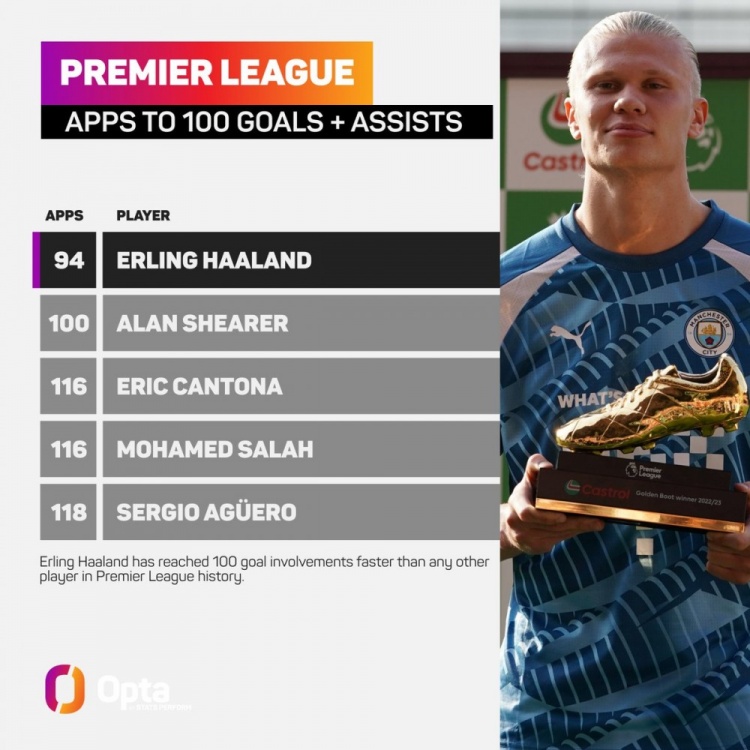 英超最快參與100球榜:哈蘭德94場最少,薩拉赫、阿圭羅在列