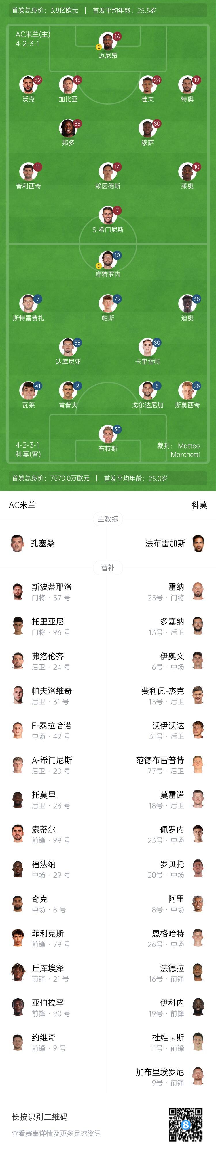 3月16日訊 意甲第29輪,AC米蘭主場對陣科莫。賽前,官方公布了本場的首發(fā)名單。