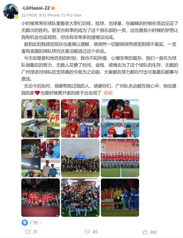 1月8日訊 廣州隊球員李嘉灝更新微博,告別球隊。