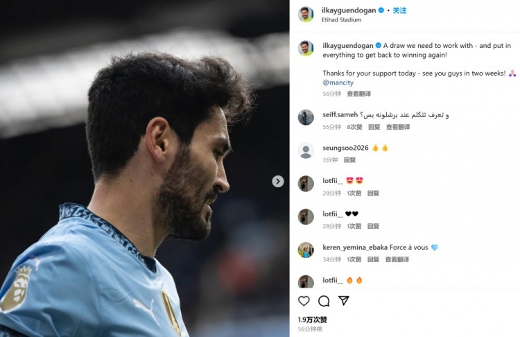 京多安表示:“我們需要汲取本場平局的教訓(xùn),并且在此后竭盡全力再次爭奪勝利。感謝球迷們今天的支持,我們兩周后再見!@曼城俱樂部”