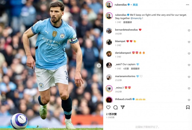 魯本-迪亞斯曬出自己的比賽照,并配文:“我們將會繼續(xù)為了目標(biāo)而戰(zhàn)斗到最后一刻。團結(jié)起來@曼城俱樂部!”