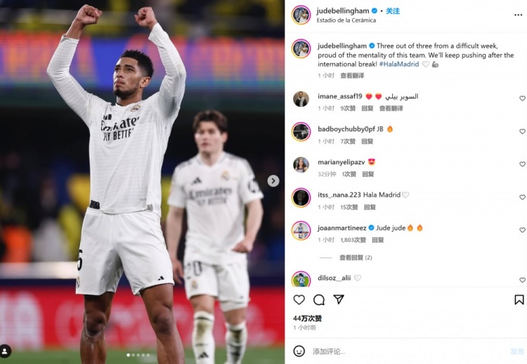 發(fā)布時間:2025年03月16日 06:50點擊:欄目:足球新聞 3月16日訊 皇馬在本輪西甲2-1逆轉比利亞雷亞爾,貝林厄姆首發(fā)踢滿全場。數據統計顯示,他在不到3天內出戰(zhàn)了210分鐘比賽。貝林厄姆也在賽后曬出慶祝照,并表示:“在艱難的一周三戰(zhàn)全勝,我為這支球隊的意志力感到驕傲。我們將在國家隊比賽周之后繼續(xù)努力。#馬德里前進 除特別注明外,本站所有內容均為九球直播整理排版,轉載請注明出處:3天內踢滿210分鐘!貝林社媒:一周3戰(zhàn),為球隊的意志力感到驕傲 本文標簽: 足球 西甲 皇家馬德里 比利亞雷亞爾