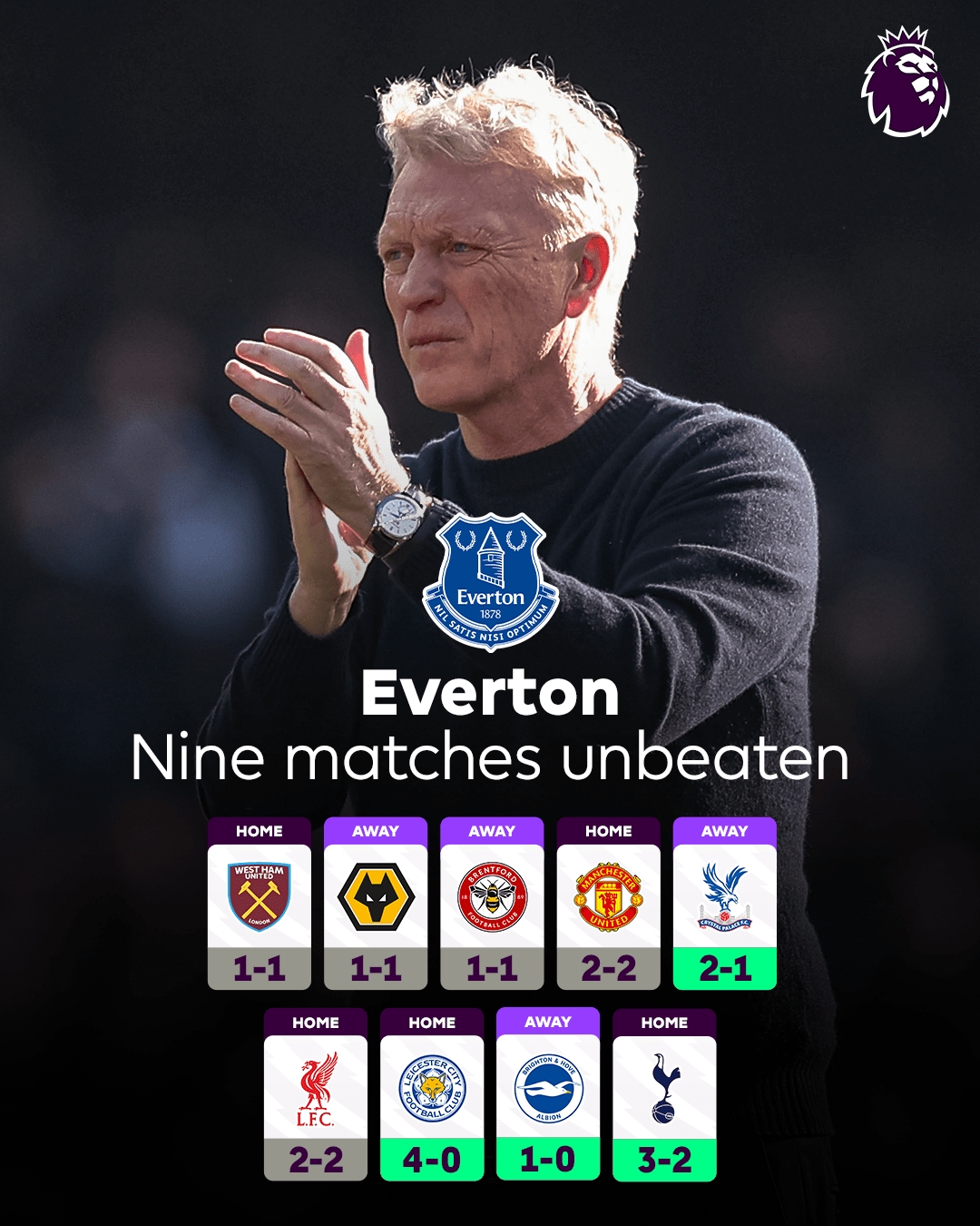 03月16日訊 英超第29輪,埃弗頓1-1戰(zhàn)平西漢姆,莫耶斯率隊聯(lián)賽9場不敗。