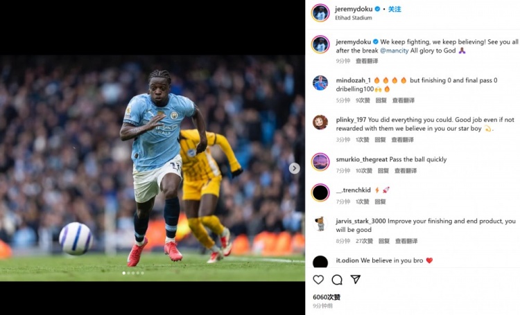 不過(guò)他依然展現(xiàn)出良好心理素質(zhì),在賽后曬出自己的比賽照并鼓勵(lì)道:“我們繼續(xù)戰(zhàn)斗,我們依然堅(jiān)信!和大家在國(guó)家隊(duì)比賽周之后再見(jiàn)!@曼城俱樂(lè)部。榮耀歸于上帝。”