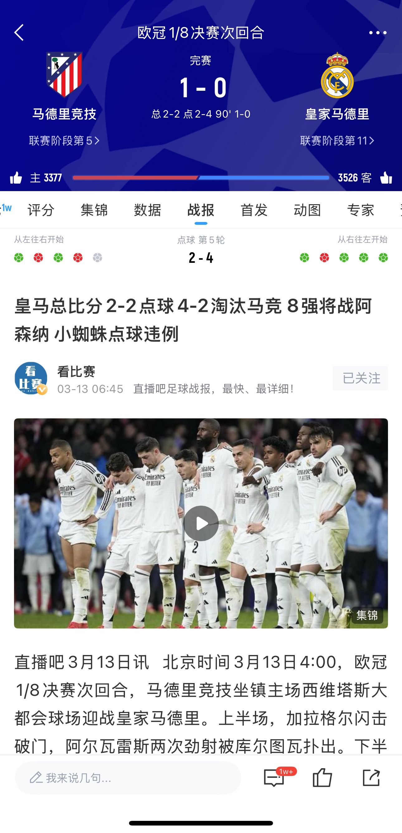 3月13日4:00,歐冠1/8決賽次回合,皇馬客戰(zhàn)馬競經(jīng)歷加時、點球大戰(zhàn),鏖戰(zhàn)2小時45分鐘。