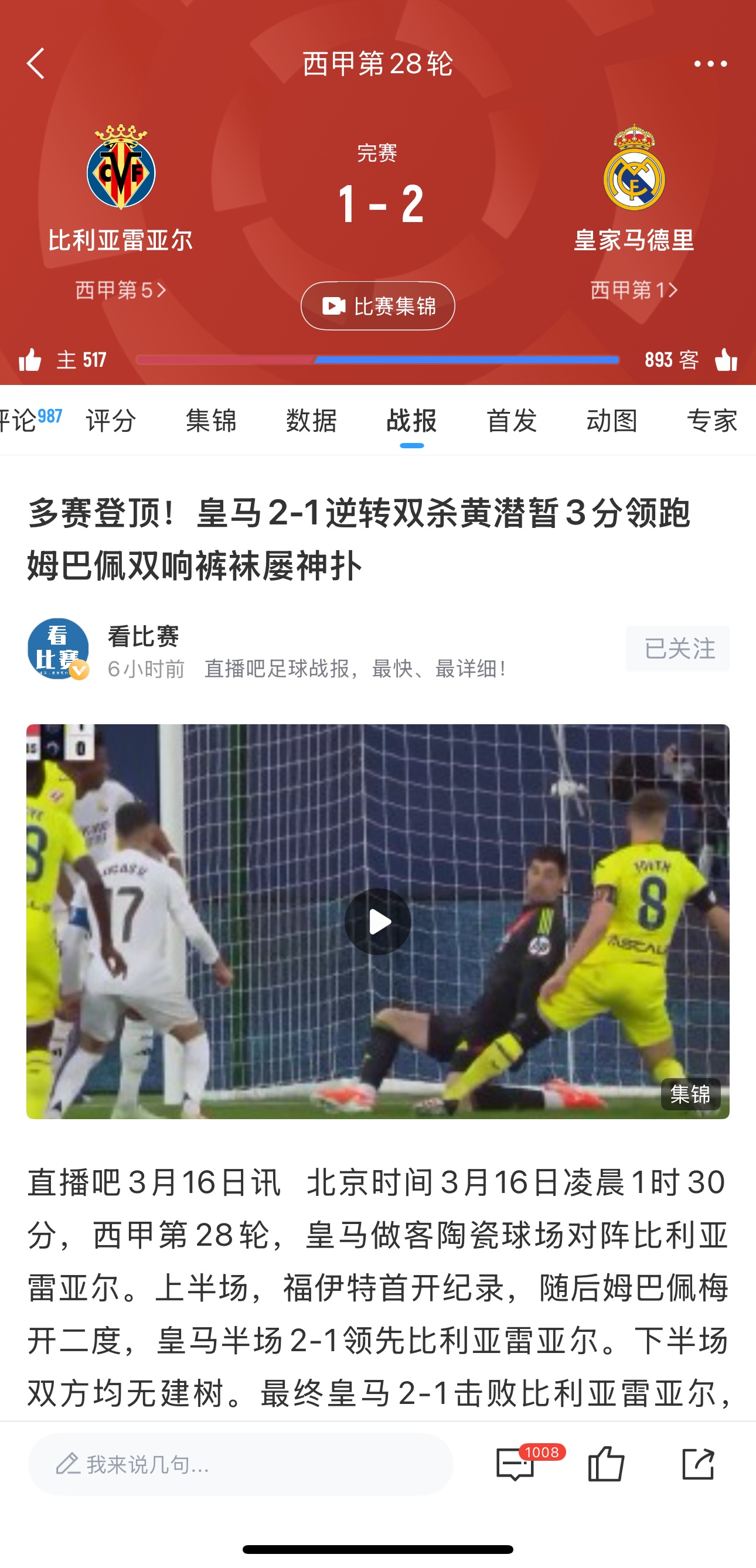 3月16日1:30,西甲第28輪,皇馬客戰(zhàn)比利亞雷亞爾(馬德里與比利亞雷亞爾市相距約400公里),皇馬激戰(zhàn)近2小時逆轉(zhuǎn)取勝。
