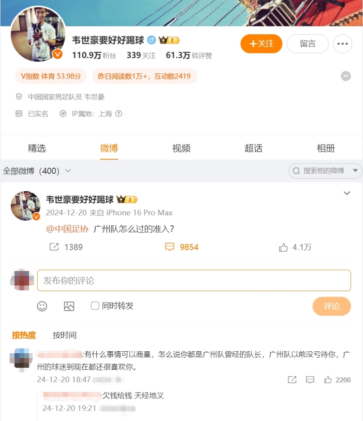 在此之前,足協(xié)12月20日公示第二批完成清欠名單,廣州在列,韋世豪公開發(fā)聲質(zhì)疑“廣州隊(duì)怎么過的準(zhǔn)入(完成清欠)?”