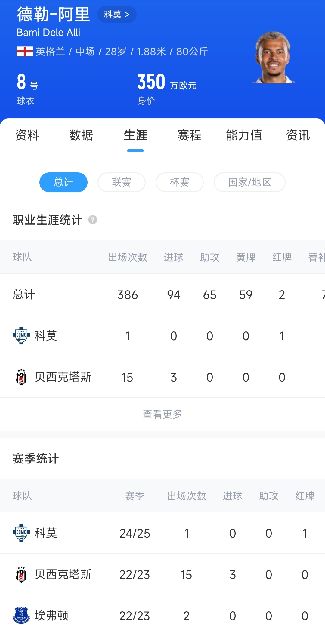 多次的轉(zhuǎn)會(huì)并沒(méi)有讓阿里找回狀態(tài),租借結(jié)束回歸埃弗頓后,阿里一直未能獲得出場(chǎng)機(jī)會(huì)。2024年7月,阿里與埃弗頓的合同到期成為自由球員。2025年1月,阿里自由身加盟科莫,簽約至2026年6月,目前28歲的阿里德轉(zhuǎn)身價(jià)僅有350萬(wàn)歐元。