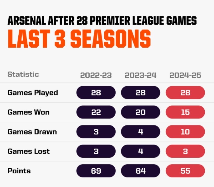 除特別注明外,本站所有內(nèi)容均為九球直播整理排版,轉(zhuǎn)載請注明出處:阿森納本賽季28輪英超積55分,比前兩個賽季同期分別少9分&14分