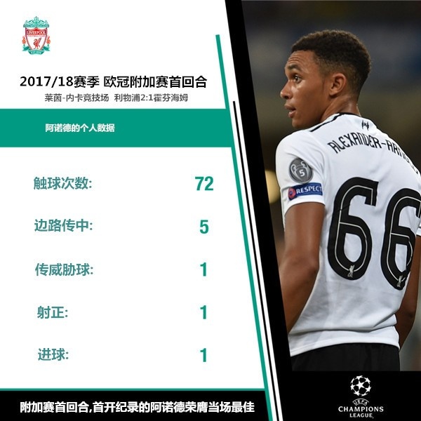 2016/17賽季,阿諾德進(jìn)入利物浦一線隊(duì),以中場身份參與輪換。2017/18賽季初,紅軍防線人手短缺,克洛普創(chuàng)造性地將阿諾德改造為右后衛(wèi),這位“The Liverpool Way”的優(yōu)秀產(chǎn)品在歐冠附加賽中上演了一球成名的好戲。在全新的位置上,阿諾德很快展現(xiàn)出了一流的傳球技巧和空間解讀能力。當(dāng)年的歐冠淘汰賽,瓜迪奧拉曾安排薩內(nèi)猛攻阿諾德,后者頂住了壓力,自此在主力陣容中站穩(wěn)了腳跟。